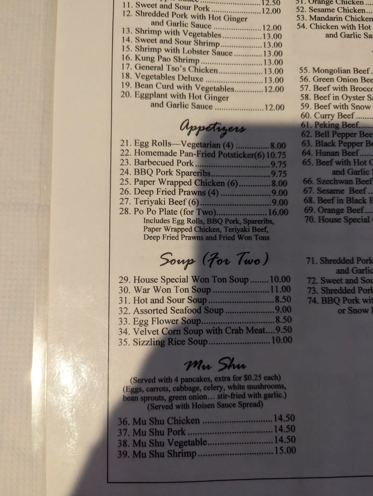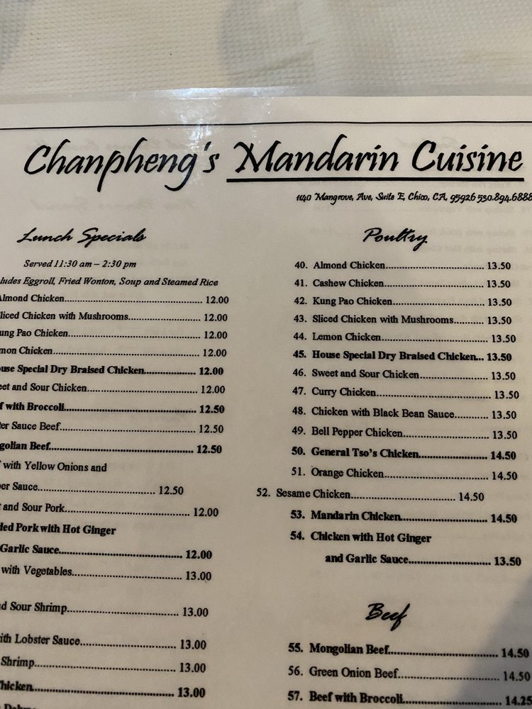 Chan Pheng’s Mandarin Cuisine is a hidden gem in Chico, known for its mouthwatering Chinese dishes. Nestled in a convenient location, this restaurant offers a variety of options, from delectable Wor Wonton soup to crispy Egg rolls and flavorful General's Chicken. The reviews from customers rave about the friendly staff, consistent excellence in food quality, and the enjoyable experience of watching the chefs in action through a window into the kitchen. Notably, the restaurant prides itself on using limited oil in their cooking, ensuring a healthier dining experience. With a menu boasting dishes like Sweet & Sour Pork, Beef with Broccoli, and Mu Shu, as well as vegetarian and chicken options, Chan Pheng’s Mandarin Cuisine guarantees a satisfying meal every time. Whether dining in or taking out, this spot is a must-try for authentic Chinese cuisine lovers in the area.